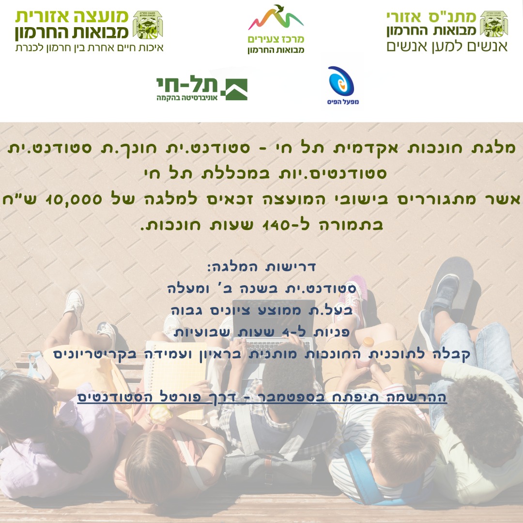 סטודנטים/יות במכללה האקדמית תל חי אשר מתגוררים ביישובי המועצה האזורית מבואות החרמון, זכאים למלגה של 10,000 ש"ח בתמורה ל-140 שעות חונכות.