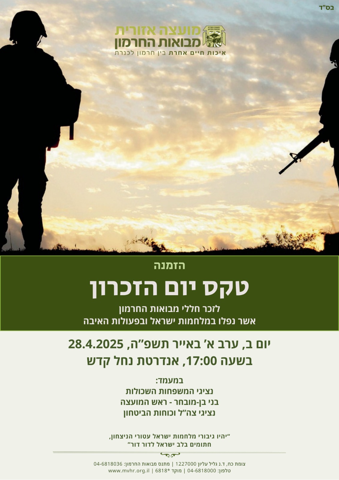הטקס יתקיים ביום שני , ערב א' באייר תשפ"ה | 28.04.2025, בשעה 17:00, באנדרטת נחל קדש (מול מתחם המועצה).