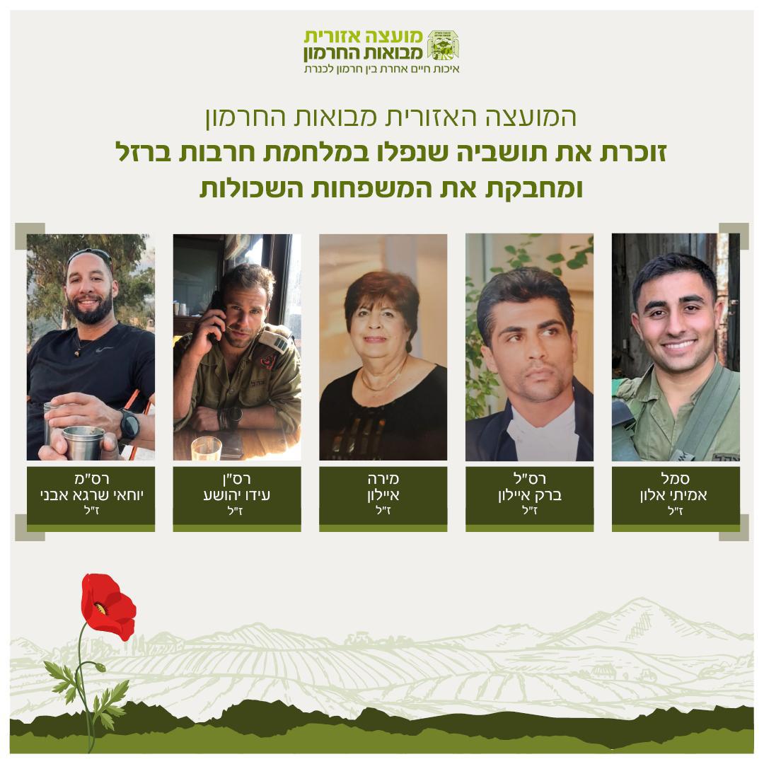 בצער עמוק ובגאווה גדולה אנו מרכינים ראש לזכר חמשת בני מבואות החרמון, שנפלו במהלך מלחמת ׳חרבות ברזל׳, בני המקום, אחינו, שחייהם נשזרו לעד בסיפור הגבורה של העם הזה.