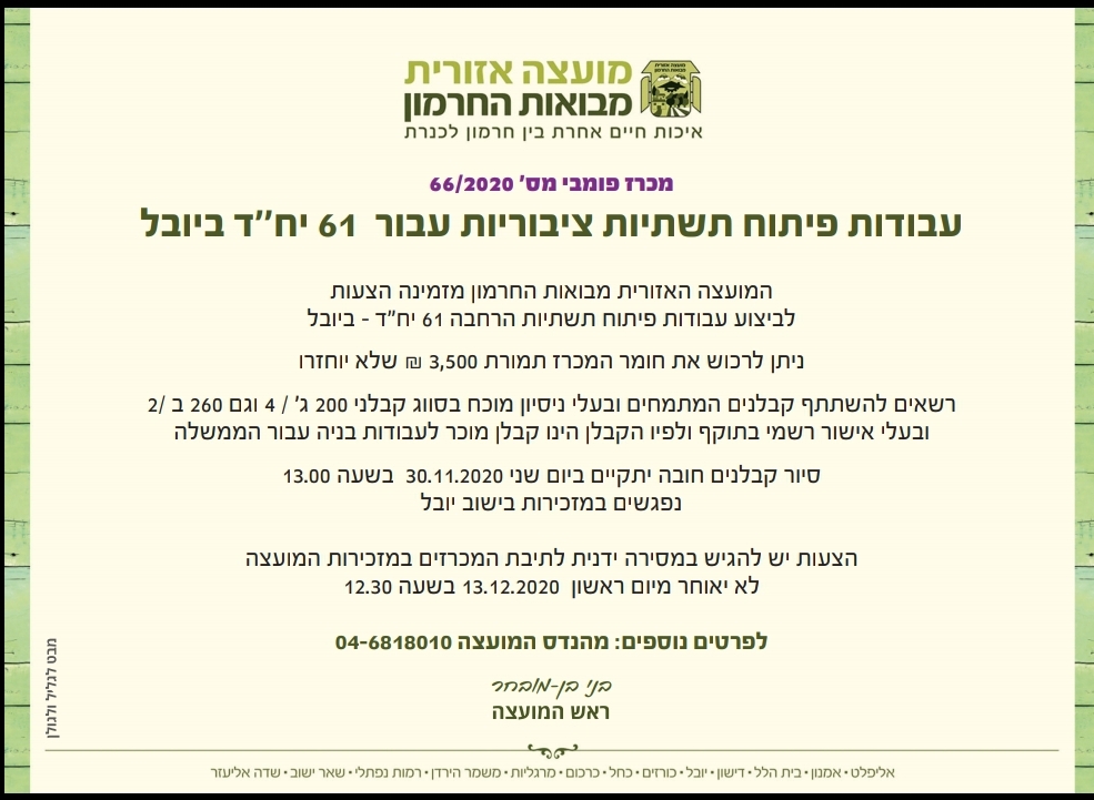 מכרז פומבי 66/2020 - לביצוע עבודות פיתוח תשתיות הרחבה 61 יח"ד – ביובל . תוקף : 13.12.2020 - בוטל !!!