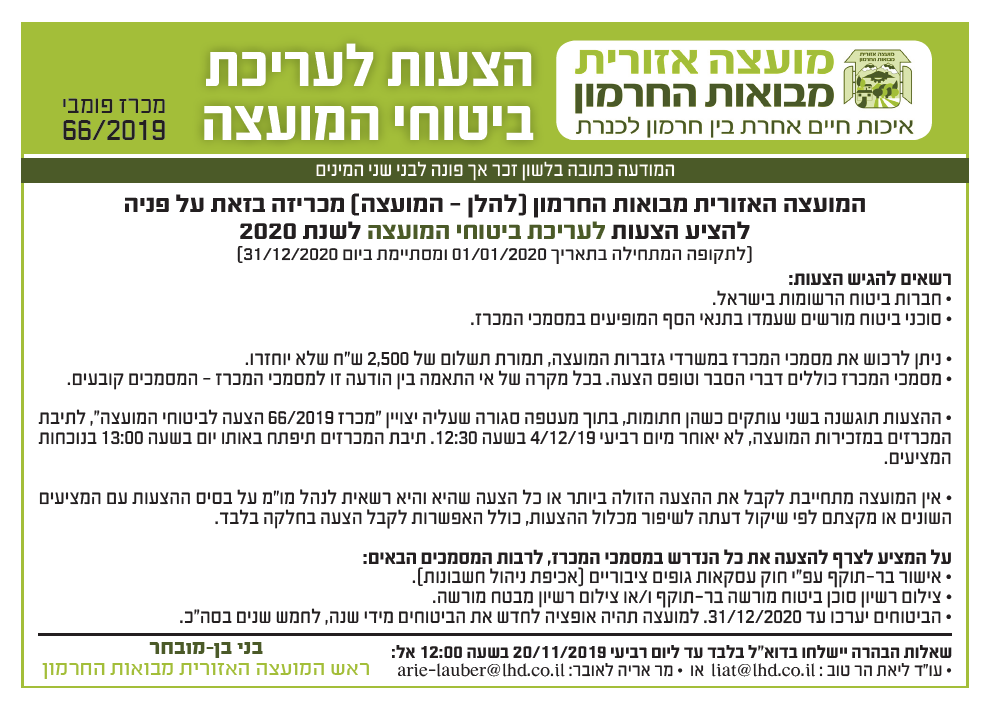 מכרז פומבי 66/2019 - הצעה לעריכת ביטוחי המועצה - תוקף 4.12.19 לא בתוקף !