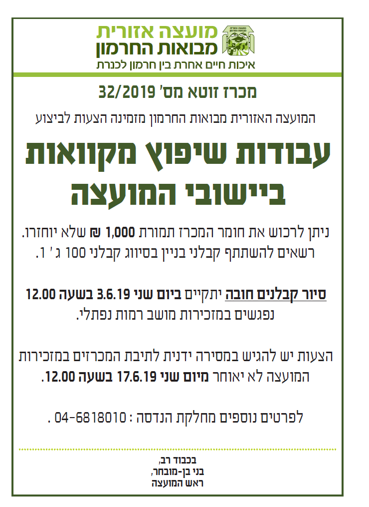 מכרז זוטא 32/2019 - עבודות שיפוץ מקוואות ביישובי המועצה תוקף 17.6.2019 לא בתוקף !