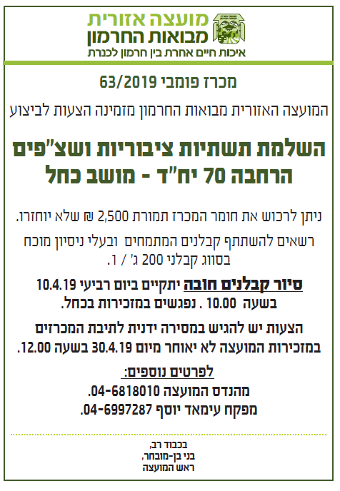 מכרז פומבי 63/2019 - השלמת תשתיות ציבוריות ושצ"פים הרחבה 70 יחד - מושב כחל תוקף עד 30.4.2019 - לא בתוקף !