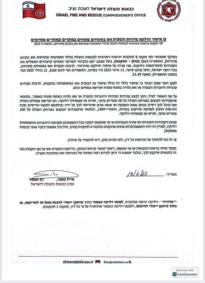 נציב כבאות והצלה לישראל רב טפסר אייל כספי חתם הבוקר (שישי, 13/6/25) על *צו איסור הדלקת אש* (לצו הנציב) מתוקף סמכותו לפי תקנה 8 לתקנות הרשות הארצית לכבאות והצלה.